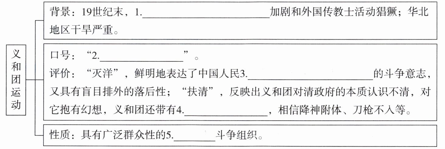 | |评价:“灭洋”,鲜明地表达了中国人民3.______的斗争意志,又具有盲目排外的落后性;“扶清”,反映出义和团对清政府的本质认识不清,对它抱有幻想,义和团还带有4.______,相信降神附体、刀枪不入等。|