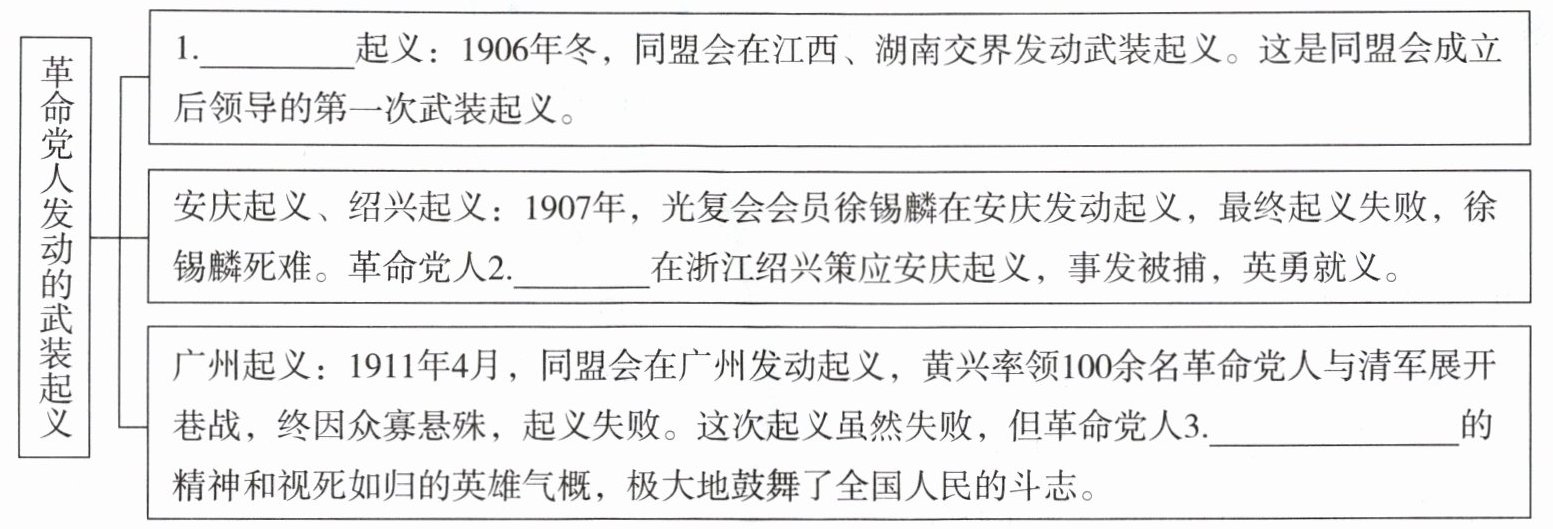 | |安庆起义、绍兴起义:1907年,光复会会员徐锡麟在安庆发动起义,最终起义失败,徐锡麟死难。革命党人2.______在浙江绍兴策应安庆起义,事发被捕,英勇就义。|