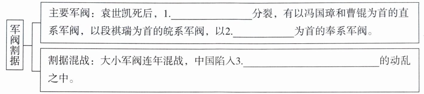 |军阀割据|主要军阀:袁世凯死后,1.____分裂,有以冯国璋和曹锟为首的直系军阀,以段祺瑞为首的皖系军阀,以2.____为首的奉系军阀。|