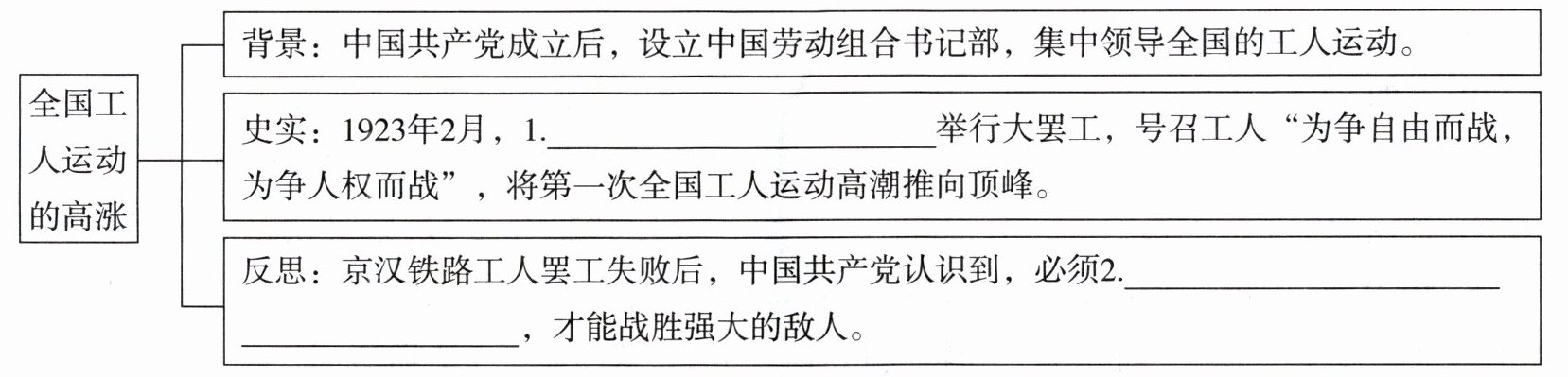 | |史实:1923年2月,1.______举行大罢工,号召工人“为争自由而战,为争人权而战”,将第一次全国工人运动高潮推向顶峰。|