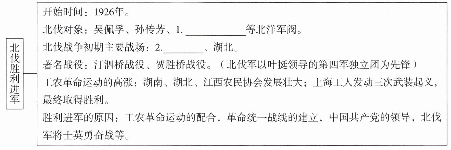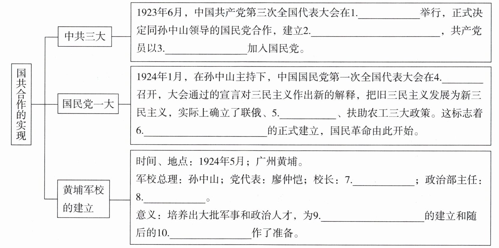 一、1.广州 2.革命统一战线 3.个人身份 4.广州 5.联共 6.国共两党合作 7.蒋介石 8.周恩来 9.国民革命军 10.北伐战争 思考 京汉铁路工人罢工失败后,中国共产党认识到,单枪匹马不能取得革命的胜利,必须团结一切可能的同盟者,才能战胜强大的敌人;孙中山在经过多次反对北洋军阀斗争的失败后,深深感到必须改组国民党,为它注入新鲜血液;共产国际的帮助;等等。