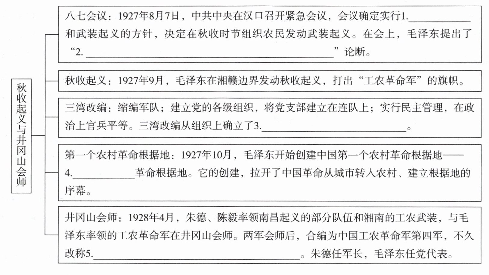 1.土地革命 2.政权是由枪杆子中取得的 3.党对军队的领导 4.井冈山 5.中国工农红军第四军