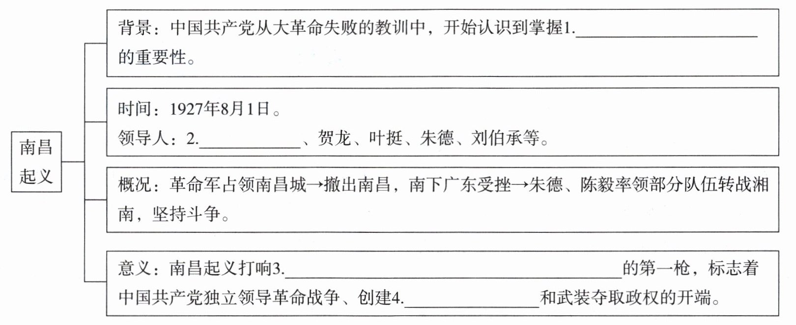|南昌起义|背景:中国共产党从大革命失败的教训中,开始认识到掌握1.______的重要性。|