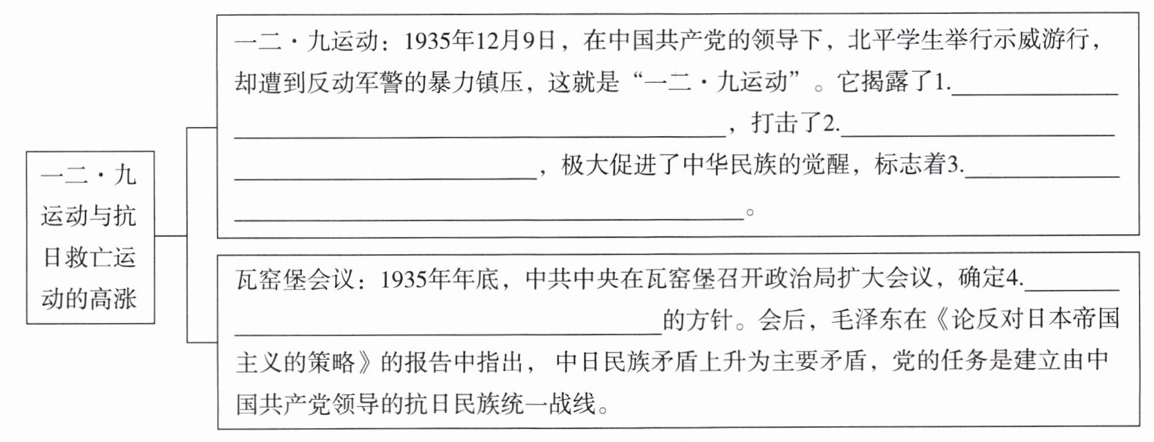 |一二·九运动与抗日救亡运动的高涨|一二·九运动:1935年12月9日,在中国共产党的领导下,北平学生举行示威游行,却遭到反动军警的暴力镇压,这就是“一二·九运动”。它揭露了1.______,打击了2.______,极大促进了中华民族的觉醒,标志着3.______。