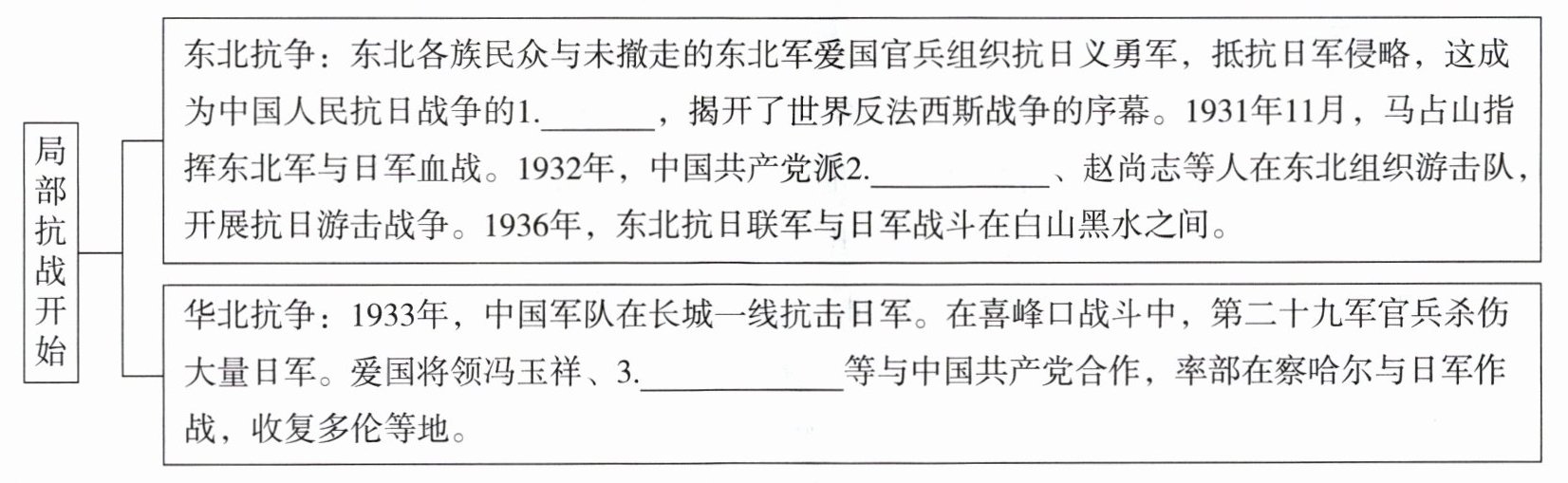 |局部抗战开始|东北抗争:东北各族民众与未撤走的东北军爱国官兵组织抗日义勇军,抵抗日军侵略,这成为中国人民抗日战争的1.______,揭开了世界反法西斯战争的序幕。1931年11月,马占山指挥东北军与日军血战。1932年,中国共产党派2.______、赵尚志等人在东北组织游击队,开展抗日游击战争。1936年,东北抗日联军与日军战斗在白山黑水之间。