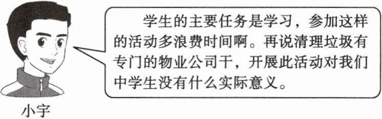 小宇同学的看法是错误的。参加这类活动并不是浪费时间,而是非常有意义的。学生的主要任务是学习,学习的方式多种多样,参加“垃圾分类桶前值守行动”也是一种学习。每个人都是社会的一员,参加垃圾分类活动实际上是我们参与社会生活的一种表现,有利于我们养成良好的行为习惯,塑造健康的人格,形成正确的价值观,获得他人和社会的接纳与认可;能够促进我们全面发展,体现人生价值。作为中学生,我们要积极融入社会,勇于承担社会责任。