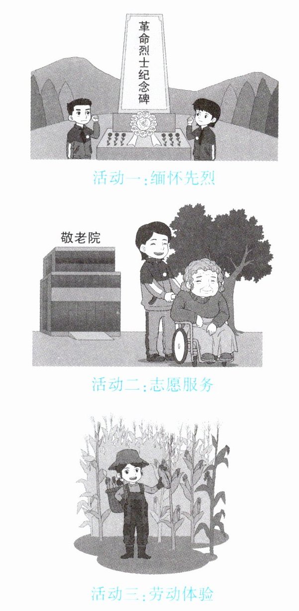 8.①我们青少年能够通过缅怀先烈活动,增强爱国主义情感,形成正确的价值观。②参加志愿服务等研学活动,有利于我们青少年参与社会生活,增强实战能力;在志愿服务时,我们青少年可以在与他人的交往互动中学会承担责任,还能够学会明辨善恶是非,遵守法律规范。③在劳动体验中,我们青少年可以更好地理解农民这一职业,培养劳动意识。等等。