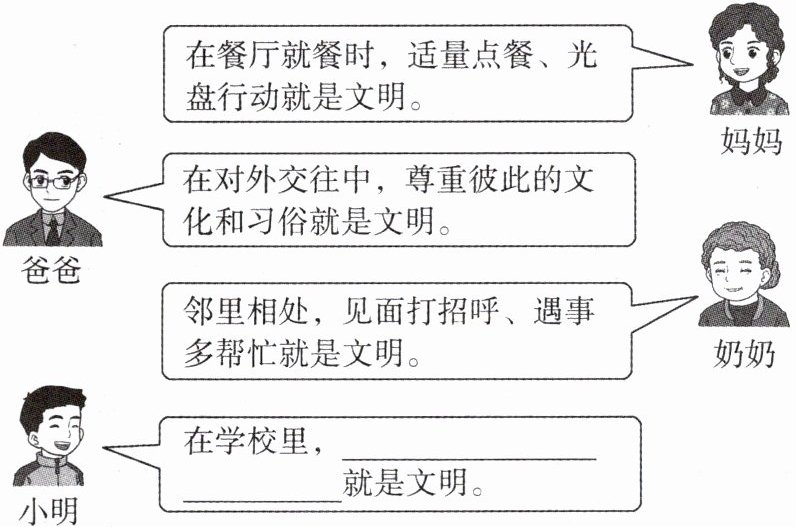 近年,各地不断深化全国文明城市创建工作,倡导人人争做文明传播者,让文明成为一道亮丽的风景线。关于如何践行文明,小明一家展开了讨论: