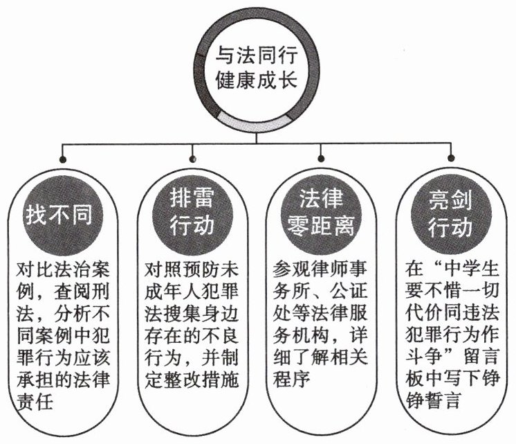 |对比法治案例,查阅刑法,分析不同案例中犯罪行为应该承担的法律责任|对照预防未成年人犯罪法搜集身边存在的不良行为,并制定整改措施|参观律师事务所、公证处等法律服务机构,详细了解相关程序|在“中学生要不惜一切代价同违法犯罪行为作斗争”留言板中写下铮铮誓言|