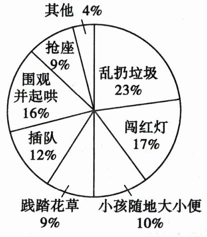 4. 近年,某研究机构对公共场所不良行为的调查显示,抢座、围观并起哄、插队和闯红灯等行为均占比不小(右图)。这项调查结果提醒人们要 【 】