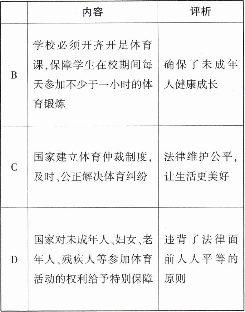 | C | 国家建立体育仲裁制度,及时、公正解决体育纠纷 | 法律维护公平,让生活更美好 |