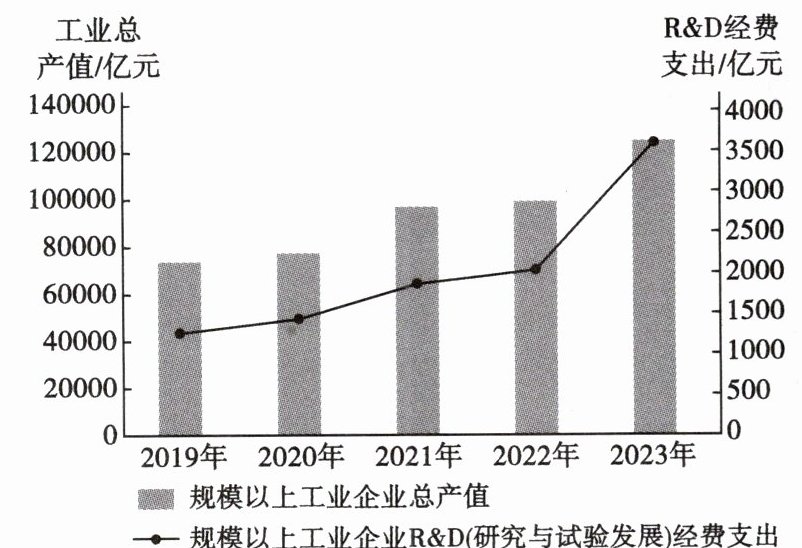 6. (2024·浙江,有改动)科技创新是发展新质生产力的核心要素。下图是2019—2023年浙江省规模以上工业企业总产值和研发经费支出的变化情况。