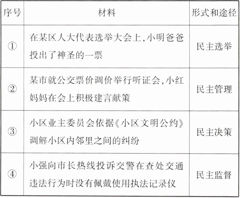 |②|某市就公交票价调价举行听证会,小红妈妈在会上积极建言献策|民主管理|