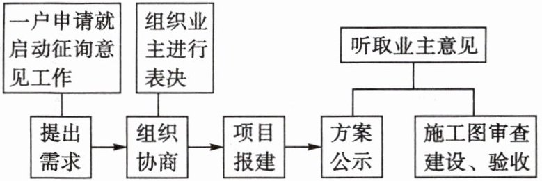①一户申请就启动征询意见工作→坚持以人民为中心 ②组织业主进行表决→调动居民参与民主协商的积极性 ③方案公示听取业主意见→业主委员会属于当地基层政府 ④施工建设听取业主意见→施工单位向居民会议汇报工作