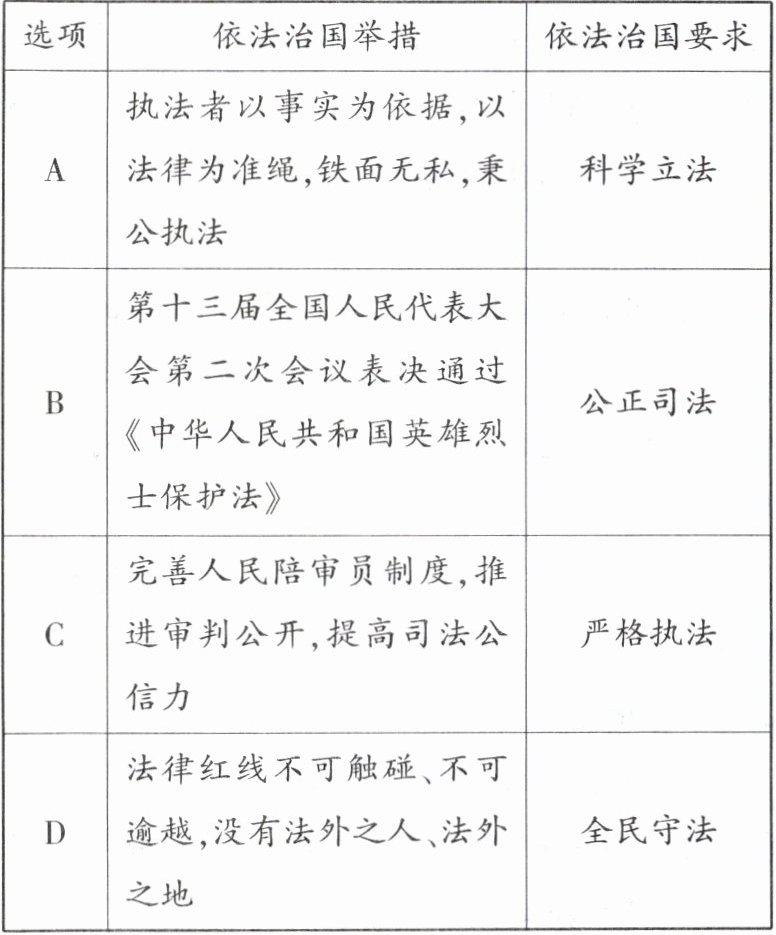 3. 党的二十大报告指出,全面推进科学立法、严格执法、公正司法、全民守法,全面推进国家各方面工作法治化。下列对依法治国举措理解正确的是【 】