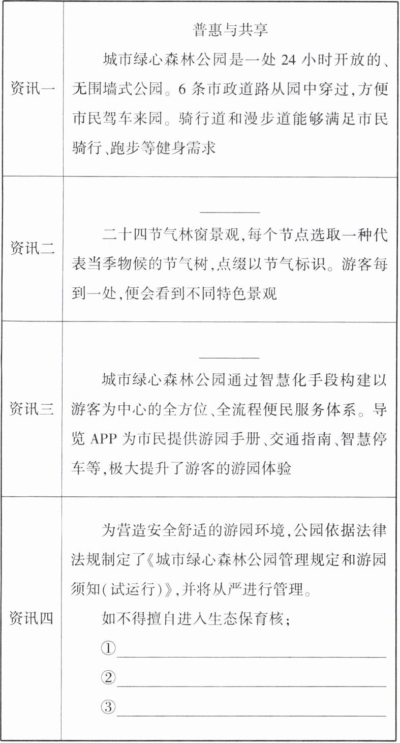 (2)同学们应具备怎样的游园意识?请阅读资讯四,依例补充画线部分的内容。