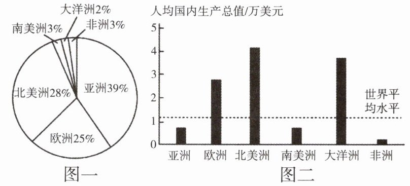 国际上一般将国内生产总值作为统计经济总量的重要指标。人均国内生产总值的高低能反映人们生活水平的高低。读 2020 年六大洲国内生产总值占世界的比重图(图一)和人均国内生产总值示意图(图二),回答 1~2 题。