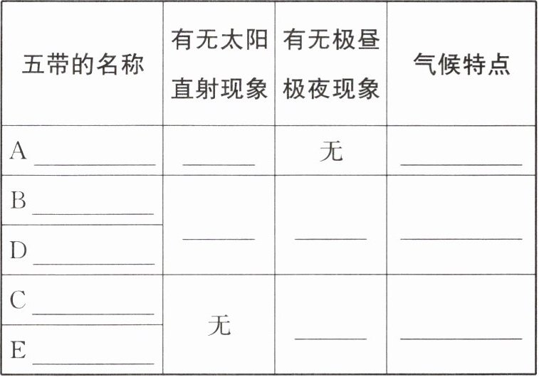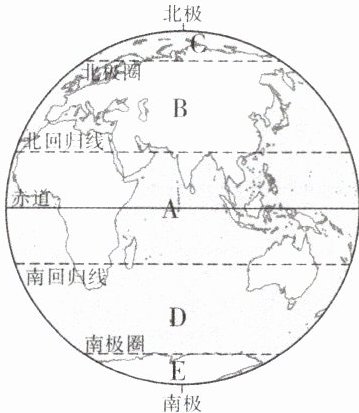 (2)A:热带;有;终年炎热;B:北温带;无;无;四季分明;D:南温带;无;无;四季分明;C:北寒带;有;终年寒冷;E:南寒带;有;终年寒冷