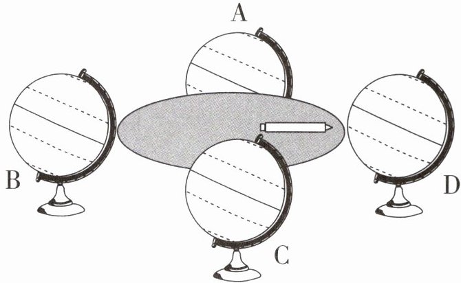 2. 随着地球仪的移动,太阳直射点不断发生变化。当地球仪移动到图中D位置时,太阳直射点位于