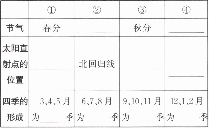 1. 节气:夏至;冬至;太阳直射点的位置:赤道;赤道;南回归线;四季的形成:春;夏;秋;冬