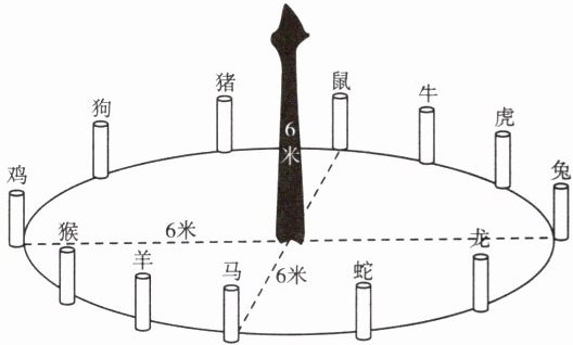 我国某城市广场修建了十二生肖柱,并均匀排列成圆形,广场中间是6米高的雕像柱,鼠柱位于正北方向(如下图)。一年中大多数日子的正午时刻,雕像柱的影子投向鼠柱。据此回答5~6题。