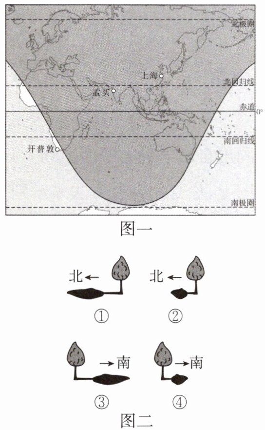 8. 某乘客乘飞机从开普敦经停孟买,飞往上海。图一为航班起飞时刻全球部分地区昼夜状况示意图,图中阴影部分表示黑夜,图二为上海某日正午树影情况示意图。读图,回答下列问题。