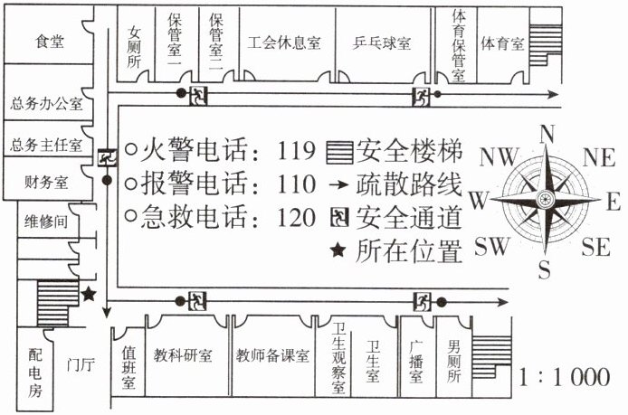 10. 陕西某学校2024年秋季开展了“开学第一天——消防安全知识进校园”活动,带领学生了解了学校安全通道的位置,增强了安全意识。活动后,地理老师带领学生绘制了下面的教学楼安全通道示意图。据此回答问题。