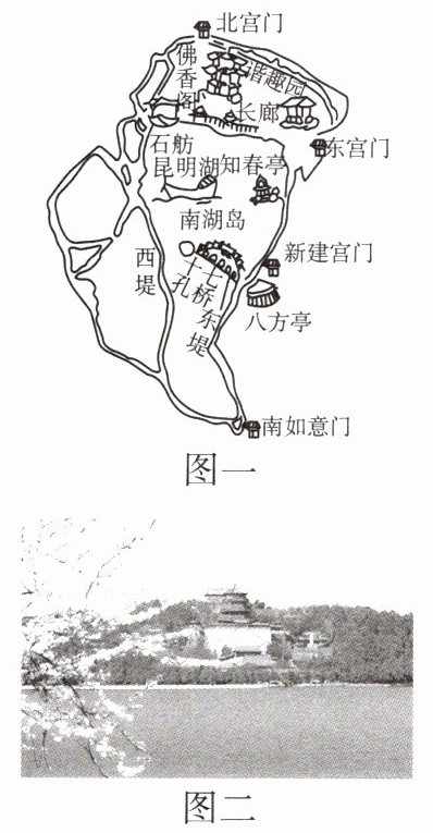 2024年3月21日,小明到颐和园踏青赏景。图一为他手绘的颐和园游览图,图二为他的摄影作品(图中有佛香阁、长廊等)。读图,回答9题。