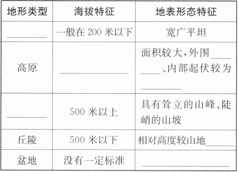 表格中空白处依次填:平原;500米以上;陡;和缓;山地;小;四周高,中间低。