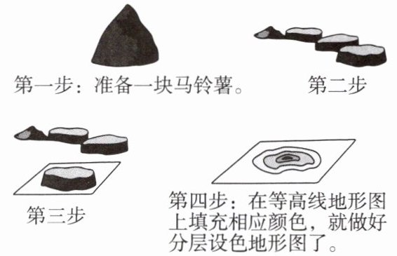 分层设色地形图是学习地理时常用的工具。小亮在老师指导下用马铃薯制作等高线地形图和分层设色地形图,步骤如下图所示。读图,回答10~11题。