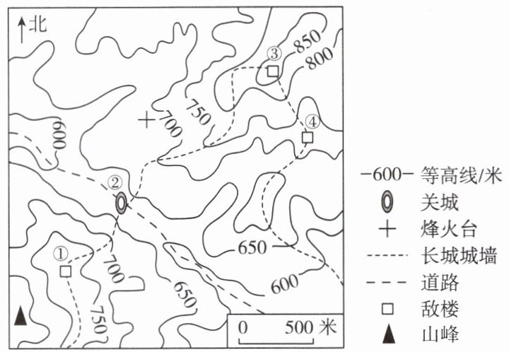北京某学校地理兴趣小组的同学要去攀登长城,并在带队老师的指导下开展野外考察活动。读长城某段等高线地形图,回答4~5题。