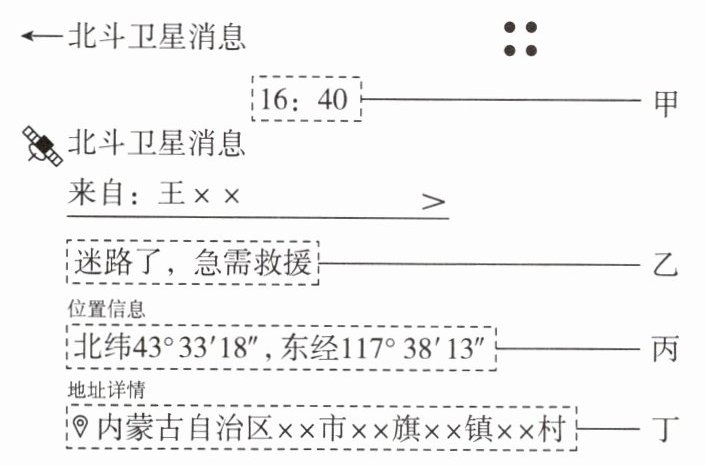 王先生和朋友在内蒙古游玩。大雪中他与朋友走散,手机也没有地面网络信号。最终,王先生用手机发送北斗卫星消息并成功获救。下图为救援队收到的求救信息。据此回答11~12题。