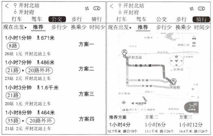 (2)查询公交线路后,推荐方案有四种。你认为贝贝可以选择