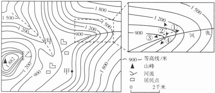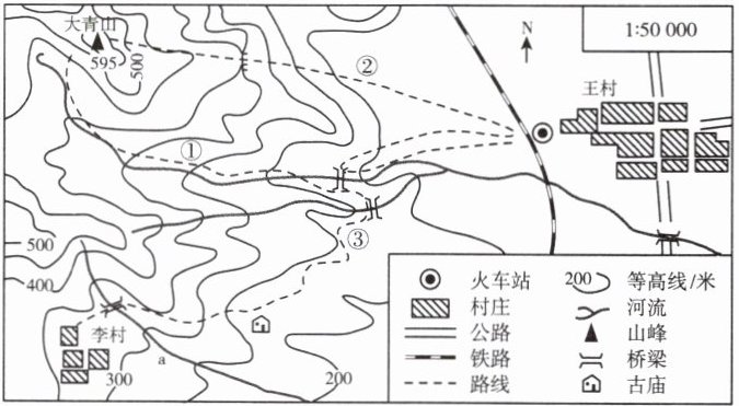 某社团要开展登山研学活动,并设计了三条活动路线:线路①——登大青山,锻炼体能;线路②——挑战攀岩,试试身手;线路③——参观古庙,探寻文化踪迹。读研学区域的等高线地形图,回答5~6题。