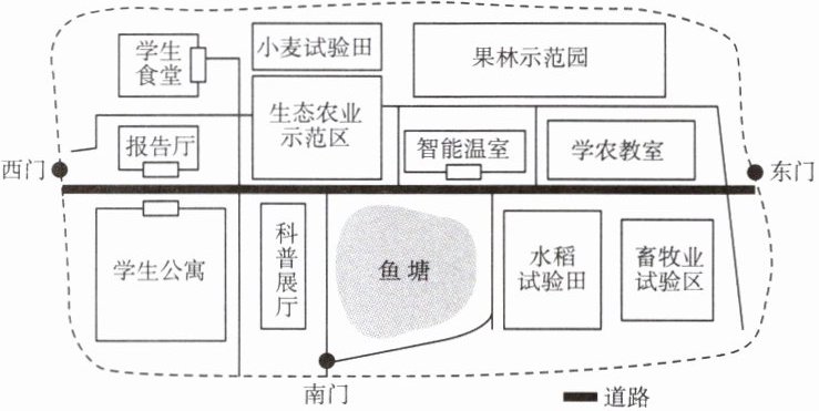 1. 昆明市某学校组织学生到劳动实践基地开展实践活动。下图为该基地平面图。由于所示平面图“三要素”不全,同学们无法(