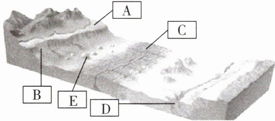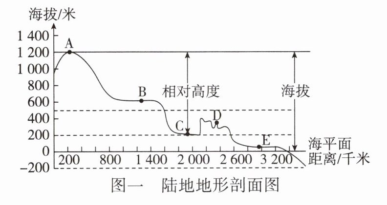 1. 读图一,写出A、B、C、D、E分别代表的地形类型的名称。