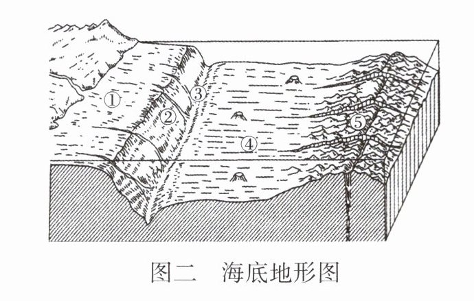 。2. 读图二,写出①②③④⑤分别代表的海底地形的名称。