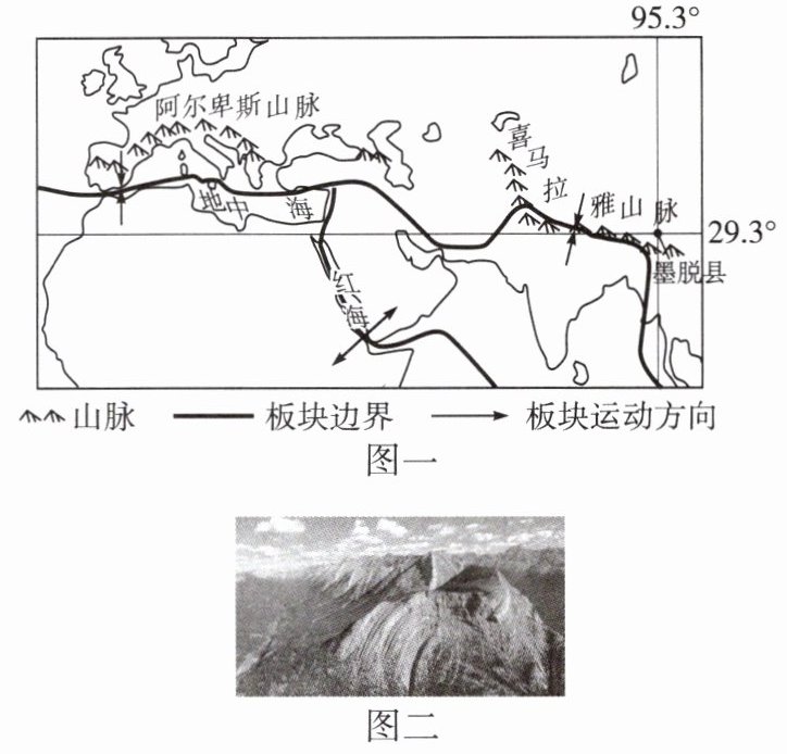 12. 2023年8月,我国西藏自治区墨脱县的小兴沿着板块交界线旅游,重点考察了喜马拉雅山脉、阿尔卑斯山脉、红海三地。小兴(以下称“我”)记录了部分地理现象,但他未解释其成因。请你参考局部地区板块示意图(图一)和阿尔卑斯山岩石褶皱景观图(图二),解释这些地理现象的成因。