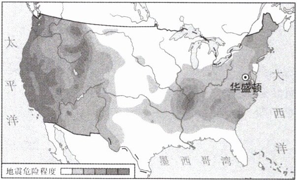 [典题3]下图为美国本土的地震危险程度示意图,颜色越深,代表地壳运动越活跃,危险程度越高。据此回答问题。