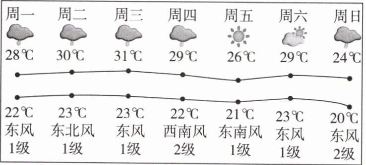 天气影响人们的生产生活,天气预报可以让人们及早了解未来的天气。下图为成都某一周的天气预报示意图。