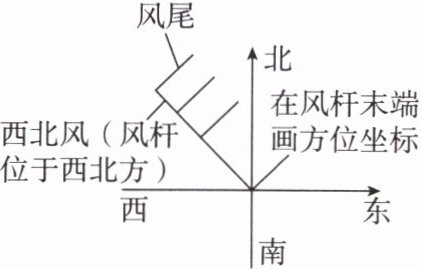 风的符号由风杆和风尾组成,风杆指示风向,风尾指示风力。判断风向的方法:在风杆末端画方位坐标,风杆所处的方向,即风向。