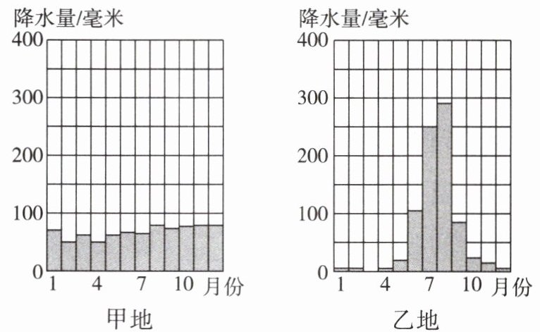 (2) 不同地区降水的季节变化不同:甲地降水的季节变化比较
