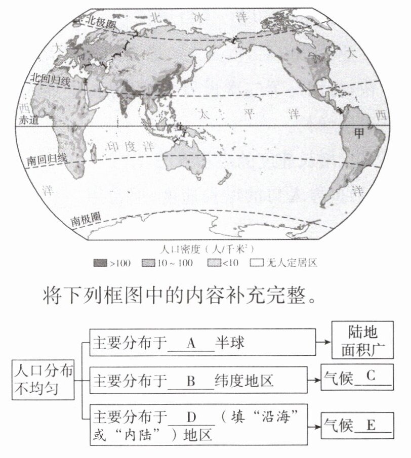 气温和降水深刻影响着人口的分布状况。下图为世界人口分布图。