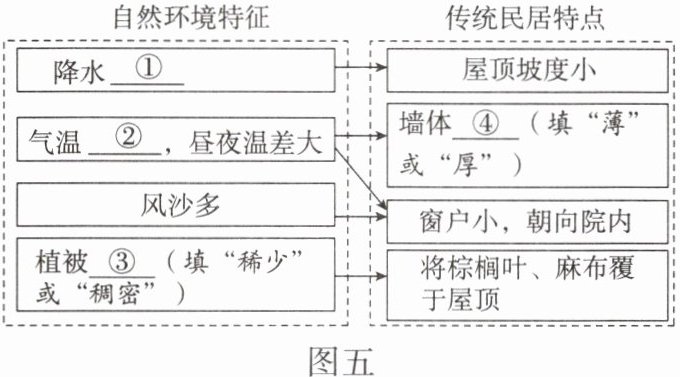 (3)根据所学知识,分析迪拜传统民居与自然环境的关系,将图五补充完整。
