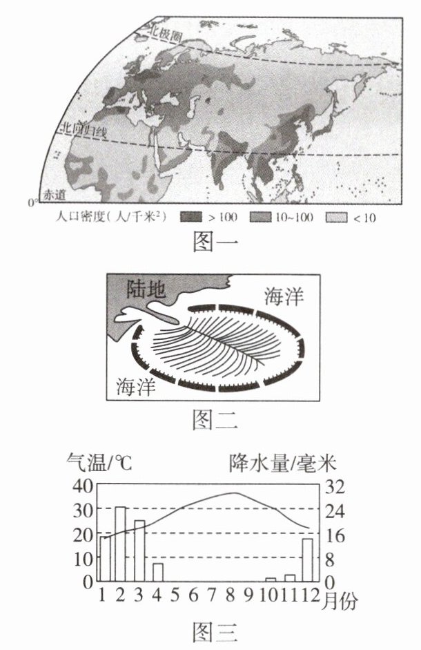 11. 迪拜杰拜勒·阿里港建设在以棕榈树为设计原型的人工岛上,该岛跨度达15千米,有65个泊位。岛上建有住宅、公寓、酒店以及主题公园。图一为世界部分地区人口分布图,图二为杰拜勒·阿里港所在人工岛模型图,图三为迪拜的气温曲线和降水量柱状图。阅读图文材料,回答问题。