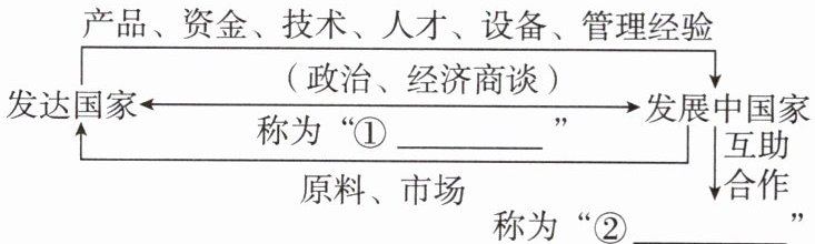 1. 发达国家经济水平高、科技发达、工业服务业为主、人均收入高;发展中国家经济水平较低、科技较落后、农业为主、人均收入低。2. 我国:资金、技术、工业制造优势;非洲国家:自然资源、劳动力优势。
