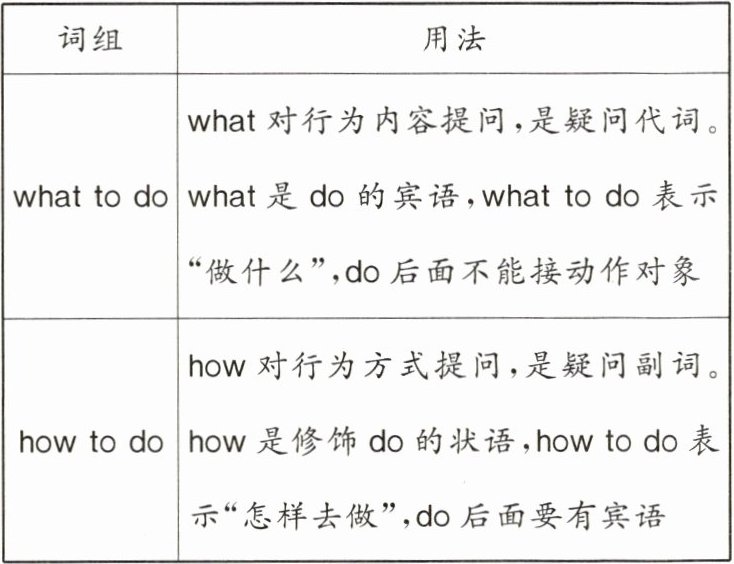 |what to do|what 对行为内容提问,是疑问代词。what 是 do 的宾语,what to do 表示“做什么”,do 后面不能接动作对象|