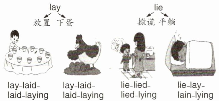 lay - laid - laid - laying(放置、下蛋);lie - lied - lied - lying(撒谎);lie - lay - lain - lying(平躺)