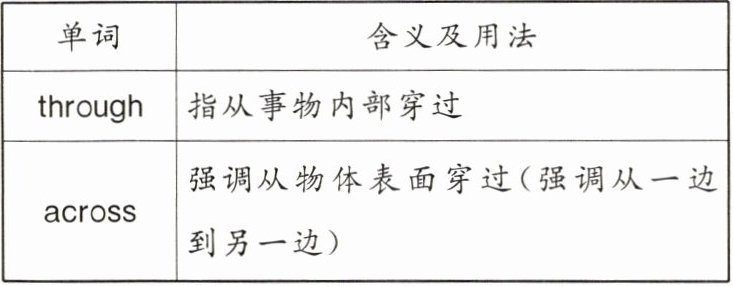 |across|强调从物体表面穿过(强调从一边到另一边)|