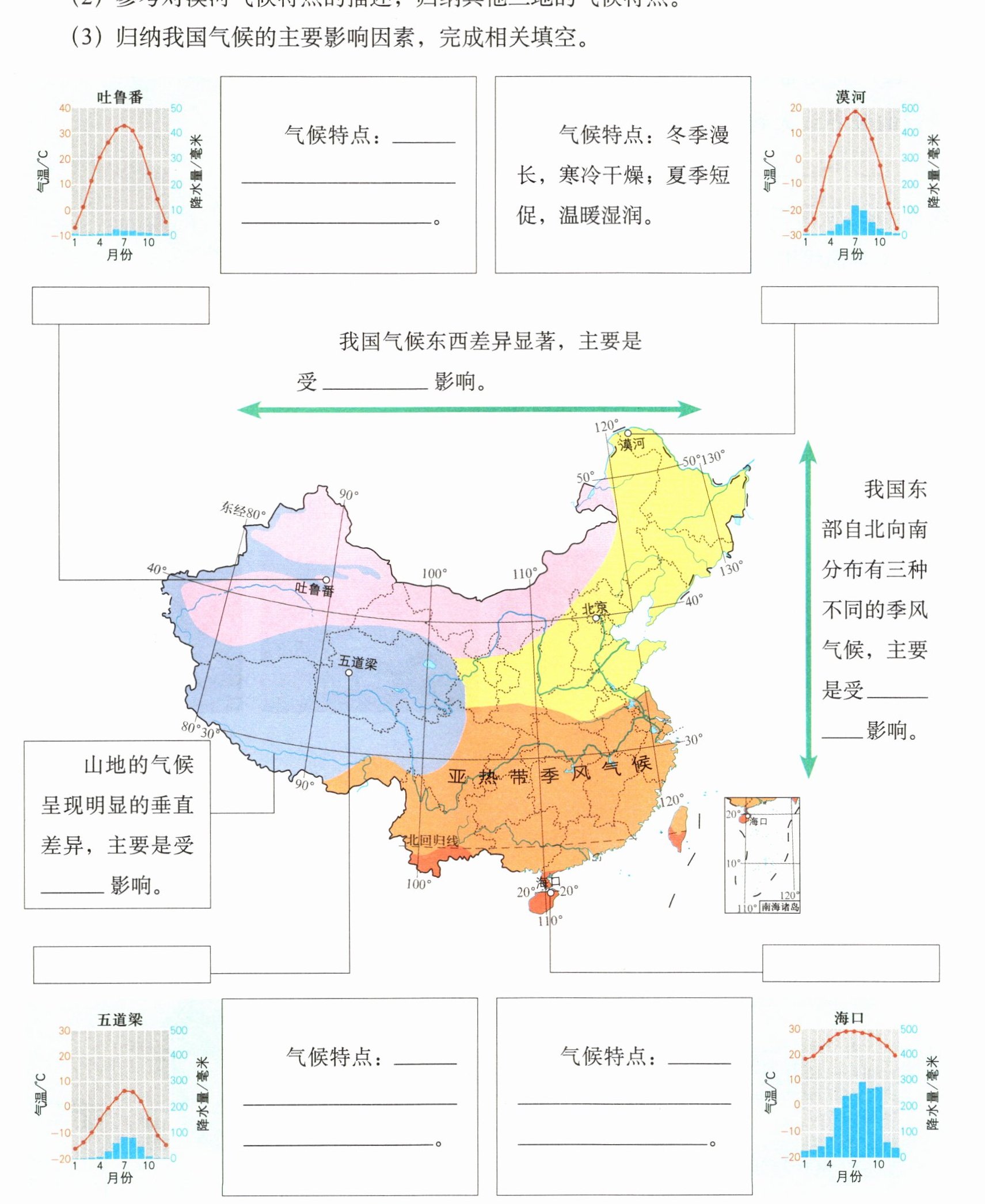 4.(1)吐鲁番:温带大陆性气候 漠河:温带季风气候 五道梁:高原山地气候 海口:热带季风气候 (2)吐鲁番:终年干燥,冬冷夏热 五道梁:全年低温,降水稀少,夏季降水稍多 海口:全年高温,分旱雨两季 (3)由上至下:海陆位置 纬度位置 地形